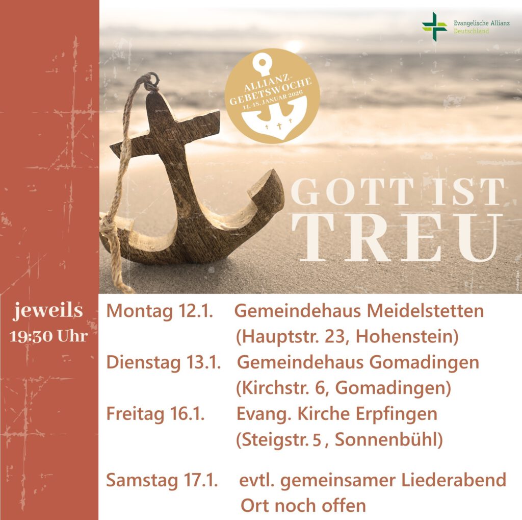 Wie jedes Jahr nehmen wir auch in diesem Jahr an der Allianzgebetswoche teil. Es ist uns wichtig, unsere Beziehungen in der evangelischen Allianz zu stärken und vor allem die Einheit in Gemeinschaft und Gebet zum Ausdruck zu bringen.