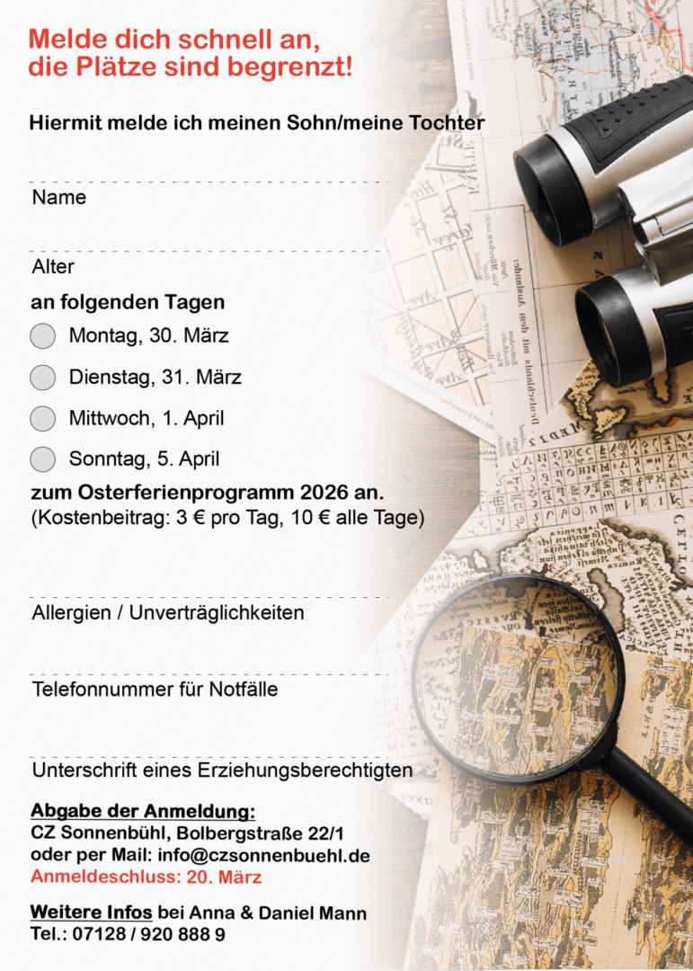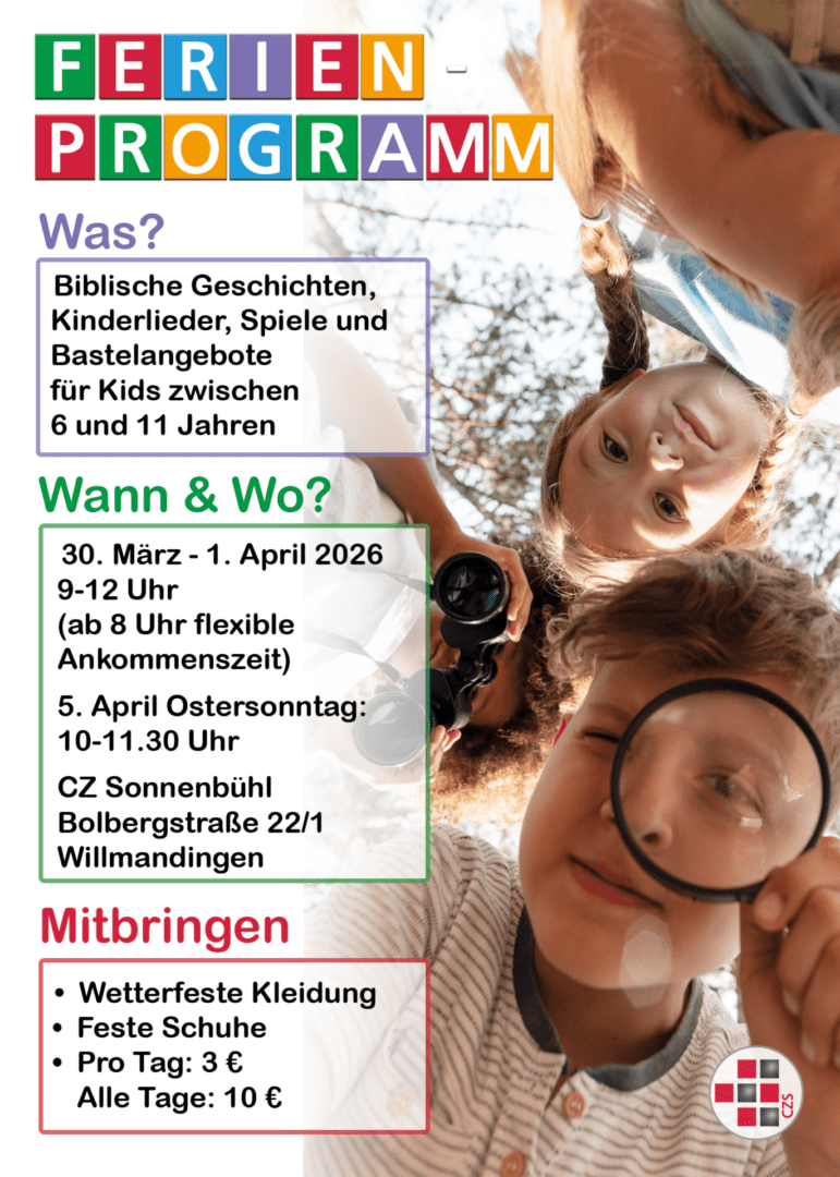 Vom 30.4.-1.4. & So. 5.4. findet wieder ein tolles Ferienprogramm bei uns im CZS statt! Also ganz schnell anmelden! 🙂